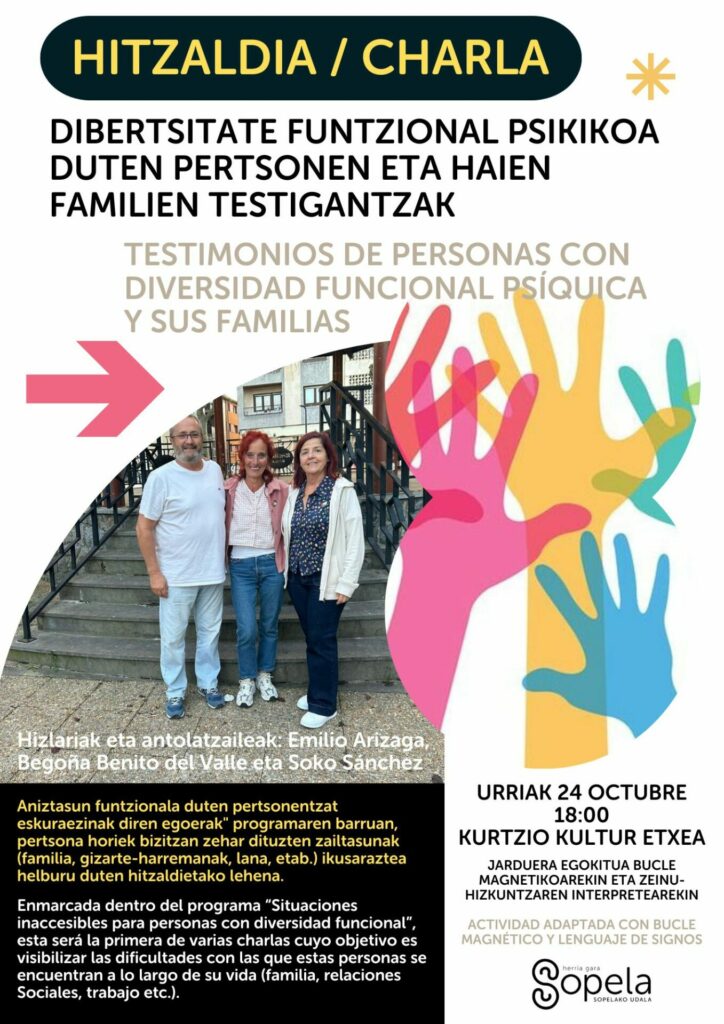 “Aniztasun funtzionala duten pertsonentzat eskuraezinak diren egoerak“ programaren barruan, pertsona horiek bizitzan zehar dituzten zailtasunak (familia, gizarte-harremanak, lana, etab.) ikusaraztea helburu duten hitzaldietako lehena izango da, gizartea kolektibo horien premien inguruan sentsibilizatzea lortzeko, gizarte inklusiboagoa eraikitzen joan ahal izateko.