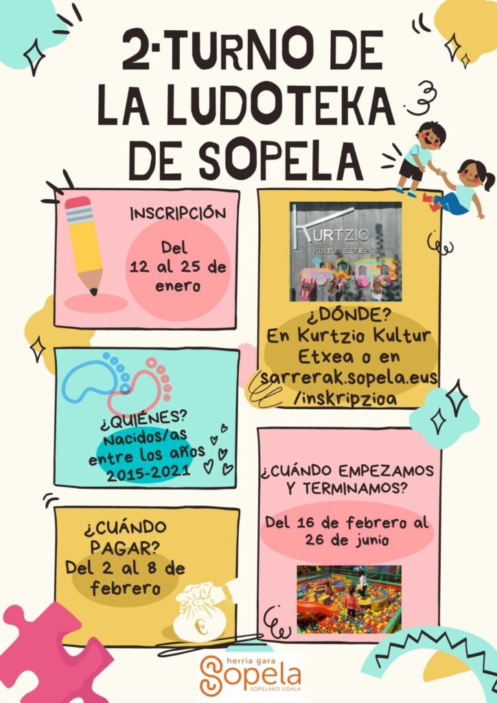 Non eman izena? Kurtzio Kultur Etxean [astelehenetik ostiralera 9:00etatik 14:00etara eta 16:00etatik 20:00etara; eta, asteburuetan 11:00etatik 14:00etara eta 17:00etatik 20:00etara] edo sarrerak.sopela.eus/inskripzioa